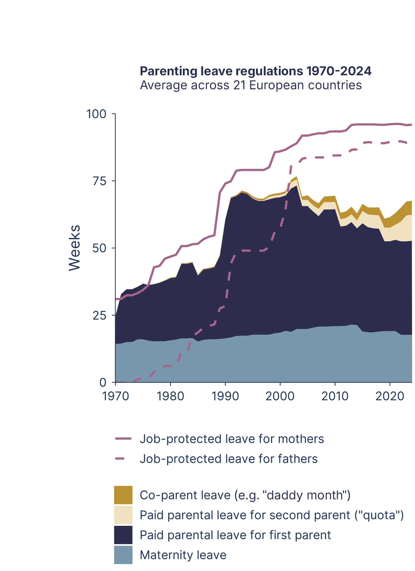 21 European countries from 1970 to 2024. These policies shape how long birth mothers and co-parents can be away from paid work around childbirth, and how leave can be shared between them.